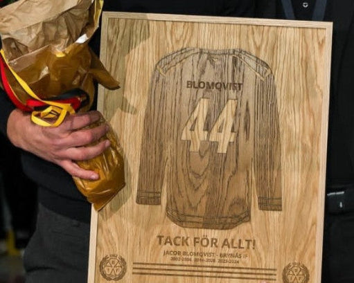 Nu ni som förening möjlighet att beställa unika och personliga hyllningstavlor med er förenings logga eller baksidan på en tröja med spelarens namn där vi även skriver in ett personligt meddelande som kommer göra den ni hyllar väldig rörd.