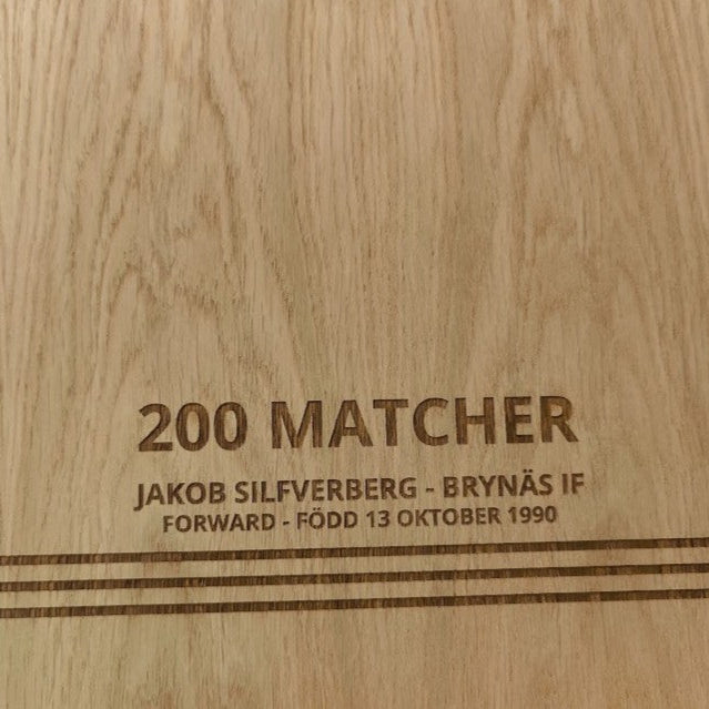 Här har vi levererat en speciell tavla där vi har en baksida matchtröja med spelarens namn och nummer. Tillsammans med en unik text där klubben ville hylla en speciell spelare. Ett exempel på hur en minnestavla kan se ut.