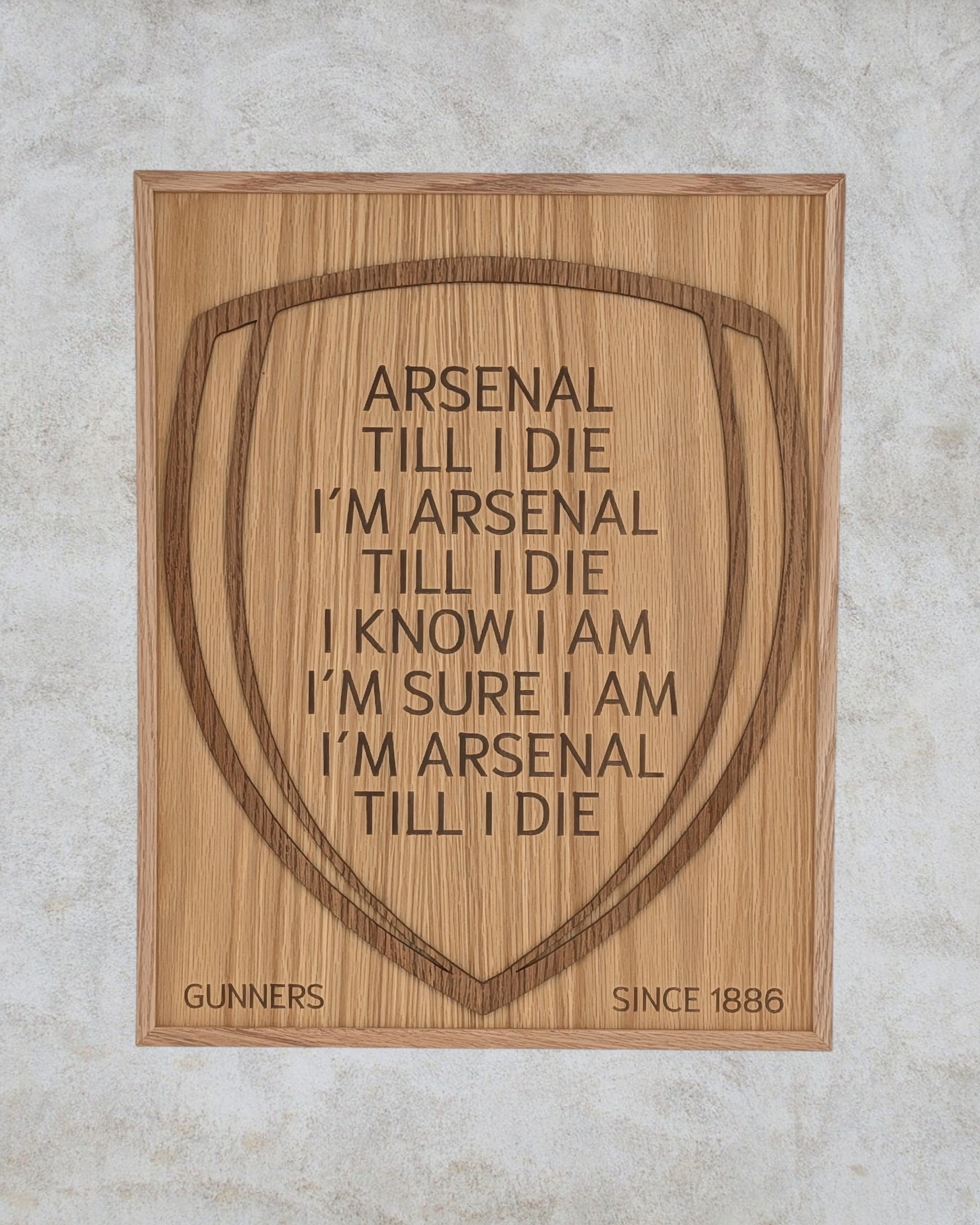 Visa din passion för Arsenal med en unik tavla i trä, skapad för den sanna supportern. Tavlan kombinerar lasergraverad text med klubbens klassiska motto "Arsenal ’Til I Die, I’m Arsenal ’Til I Die", vilket ger en djup och exklusiv känsla.